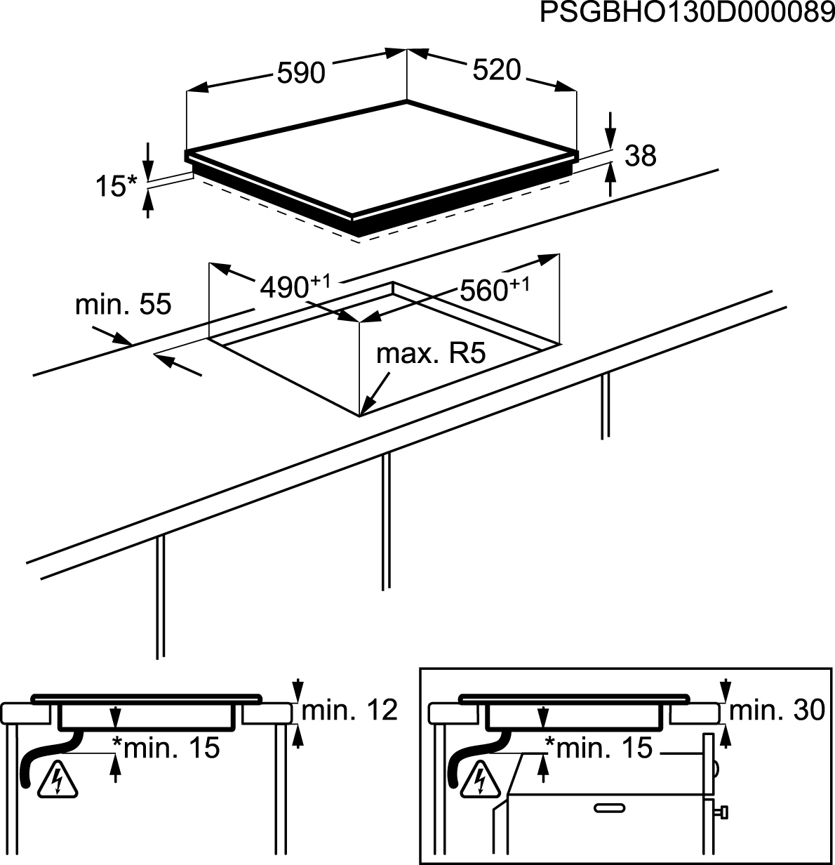Gerätemaße 38x 590 x 520 mm (HxBxT) Einbaumaße 38x 560x 490 mm (HxBxT)