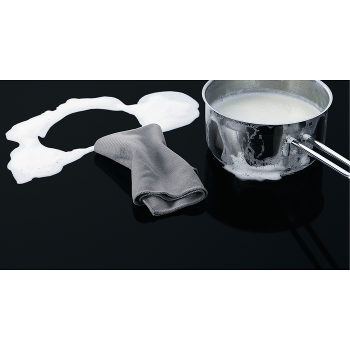 Die Kochfeldoberfläche ist vollkommen eben und kratzfest. Und da die Oberfläche um das Kochgeschirr bei Induktion kühl bleibt, erhitzen sich Spritzer nicht und brennen nicht in die Oberfläche ein. Sie können sie einfach wegwischen.