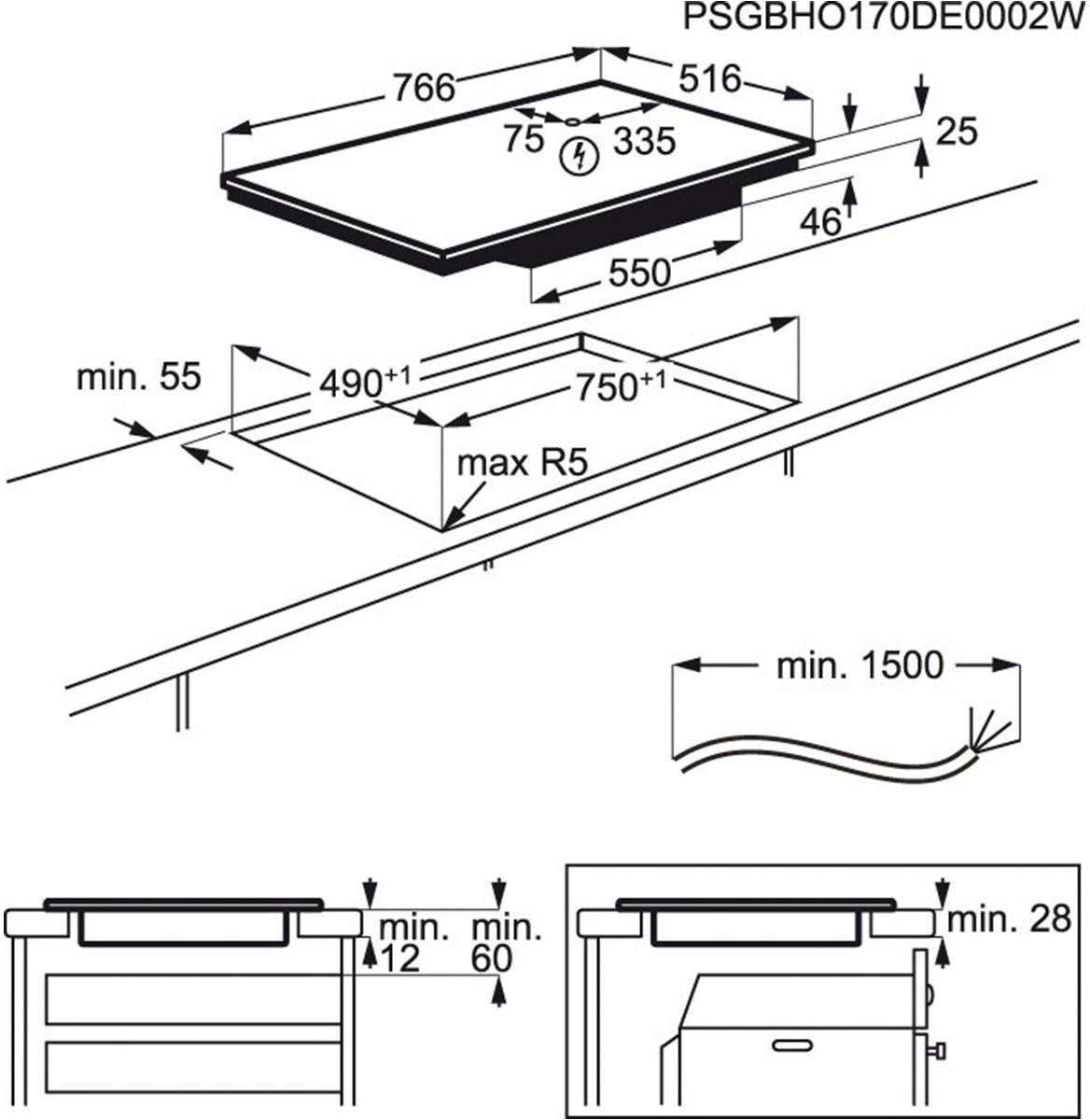 - SlimFit-Design – für den Einbau in jede Arbeitsplattentiefe: min. 12 mm, bei gleichzeitiger Installation einer Schublade oder min. 28 mm mit einem AEG-Backofen/-Herd darunter. Kein Einbau eines Schutzbodens erforderlich.