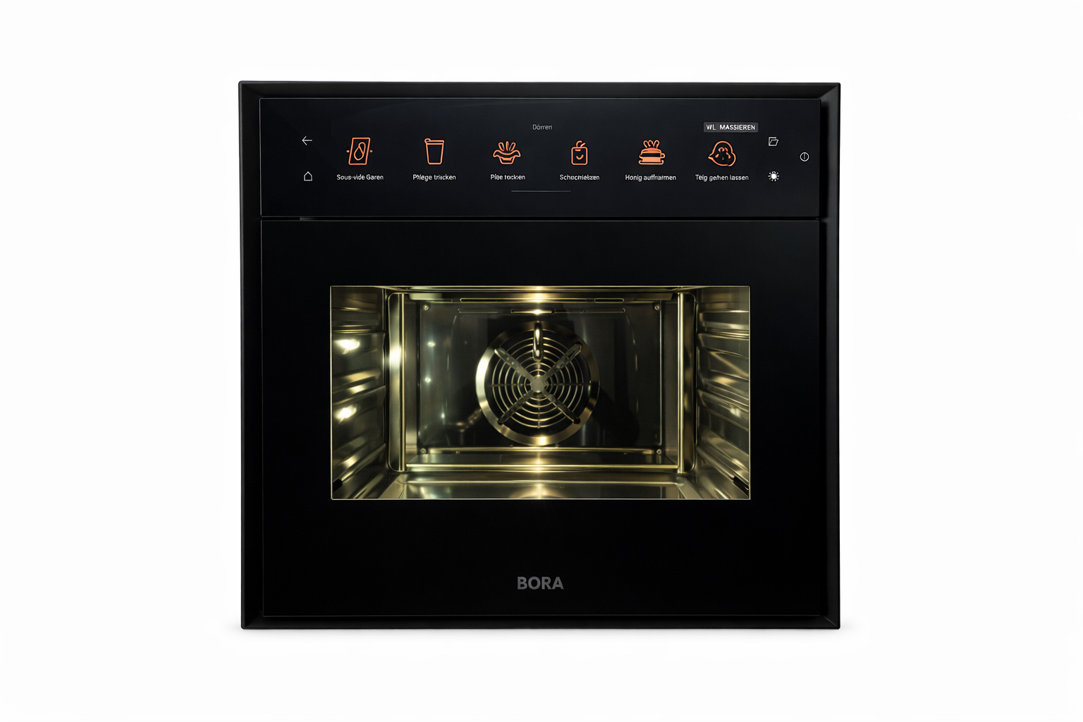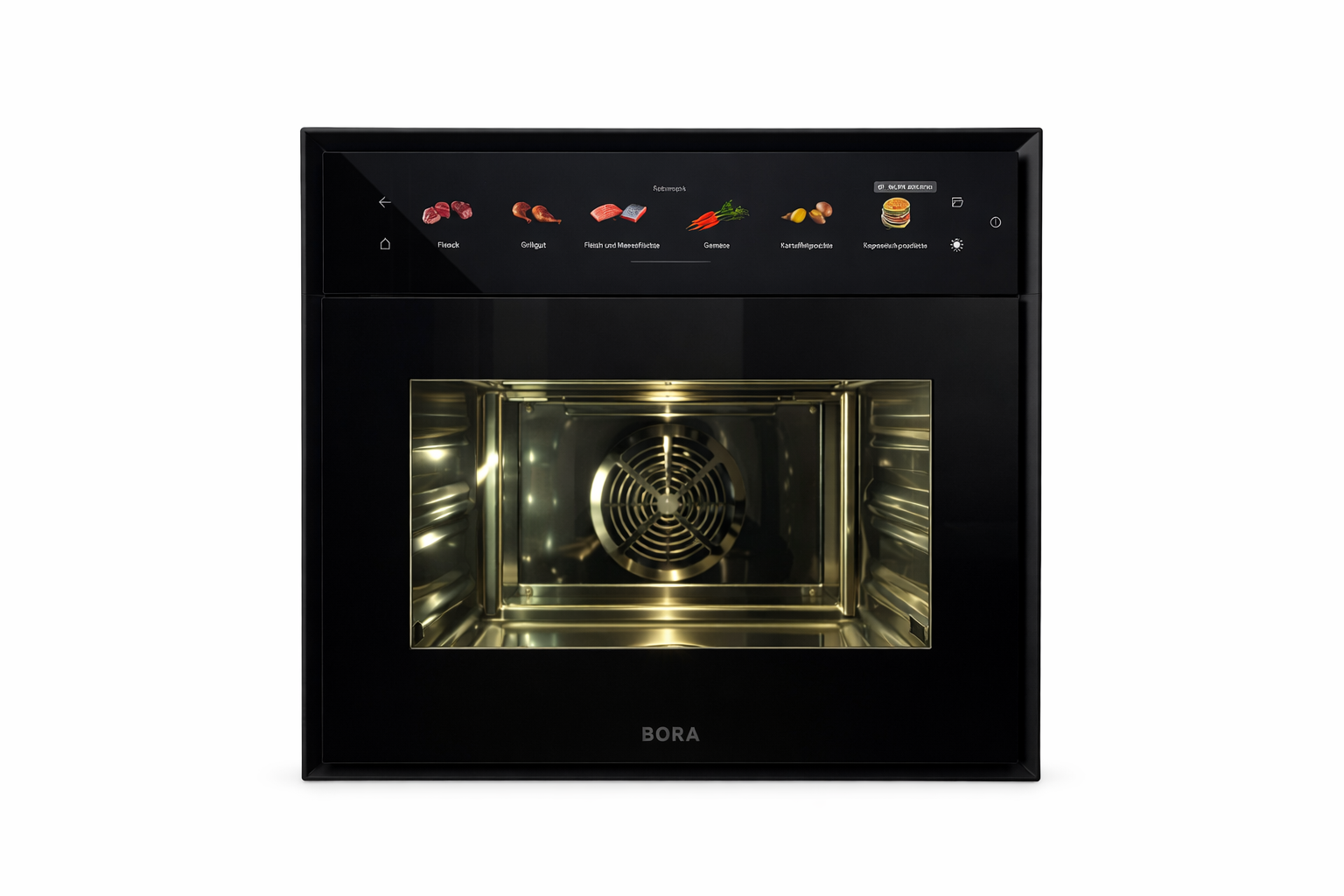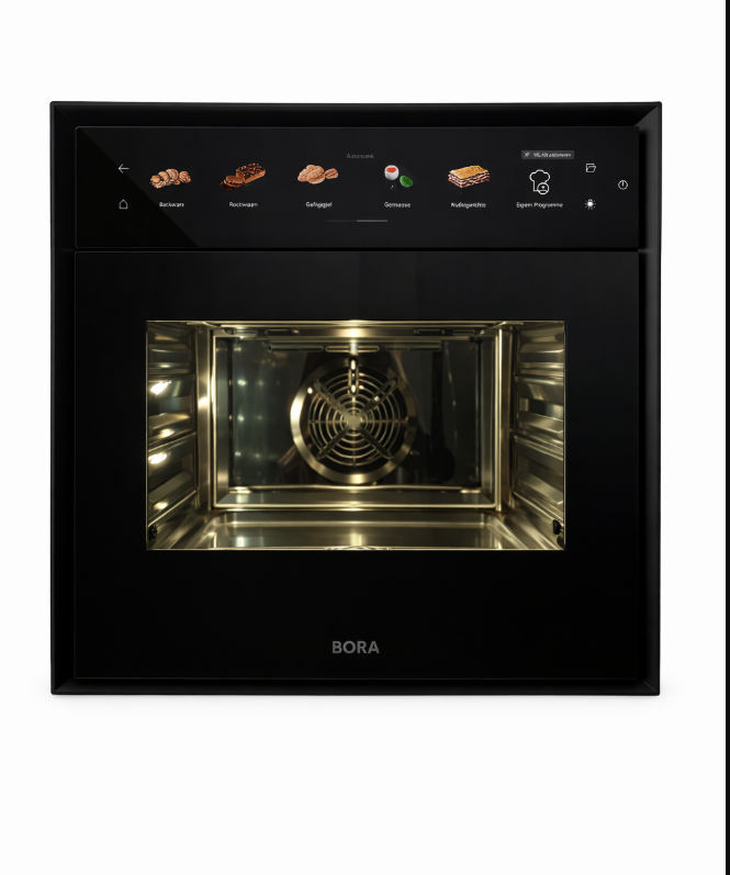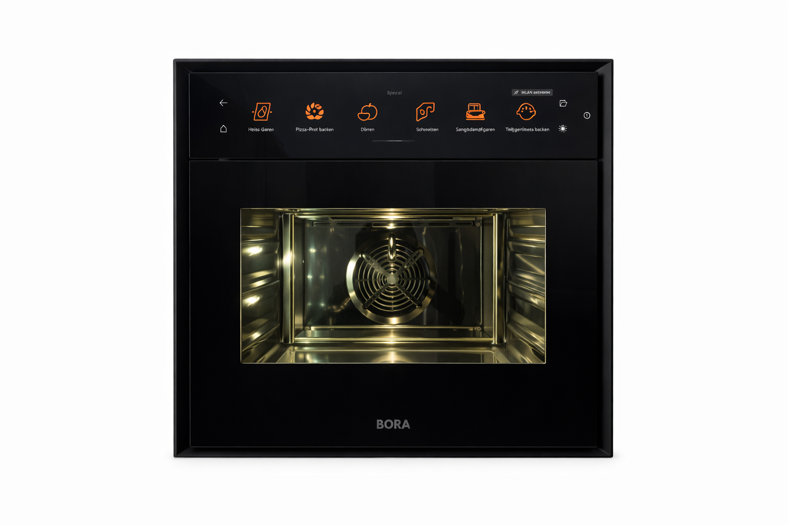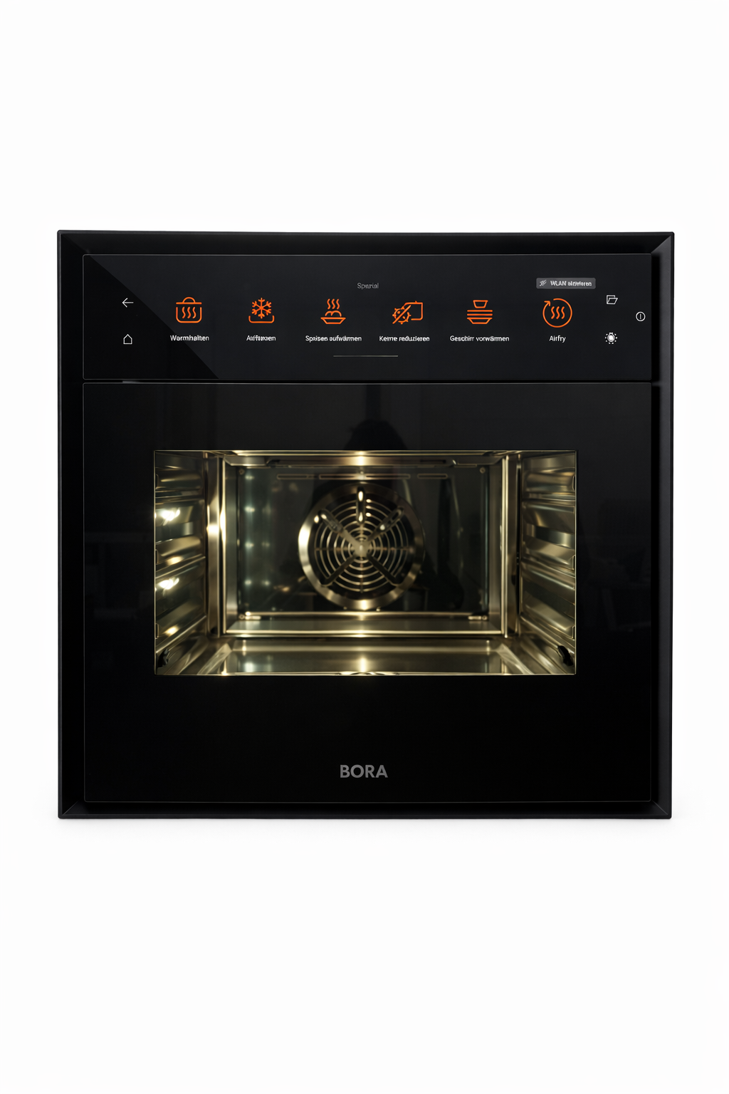 BORA X BO. Ofengröße: Medium, Garraumvolumen Gesamteinheit: 53 l, Kochtemperaturbereich: 30 - 230 °C. Produktfarbe: Schwarz, Steuerung: Berührung, Kabellänge: 2,5 m. Energieeffizienzklasse: A, Energieeffizienzskala: A+++ bis D, Energieverbrauch (erzwungene Konvektion): 0,74 kWh. Breite: 598 mm, Tiefe: 580 mm, Höhe: 599 mm. Paketgewicht: 62 kg