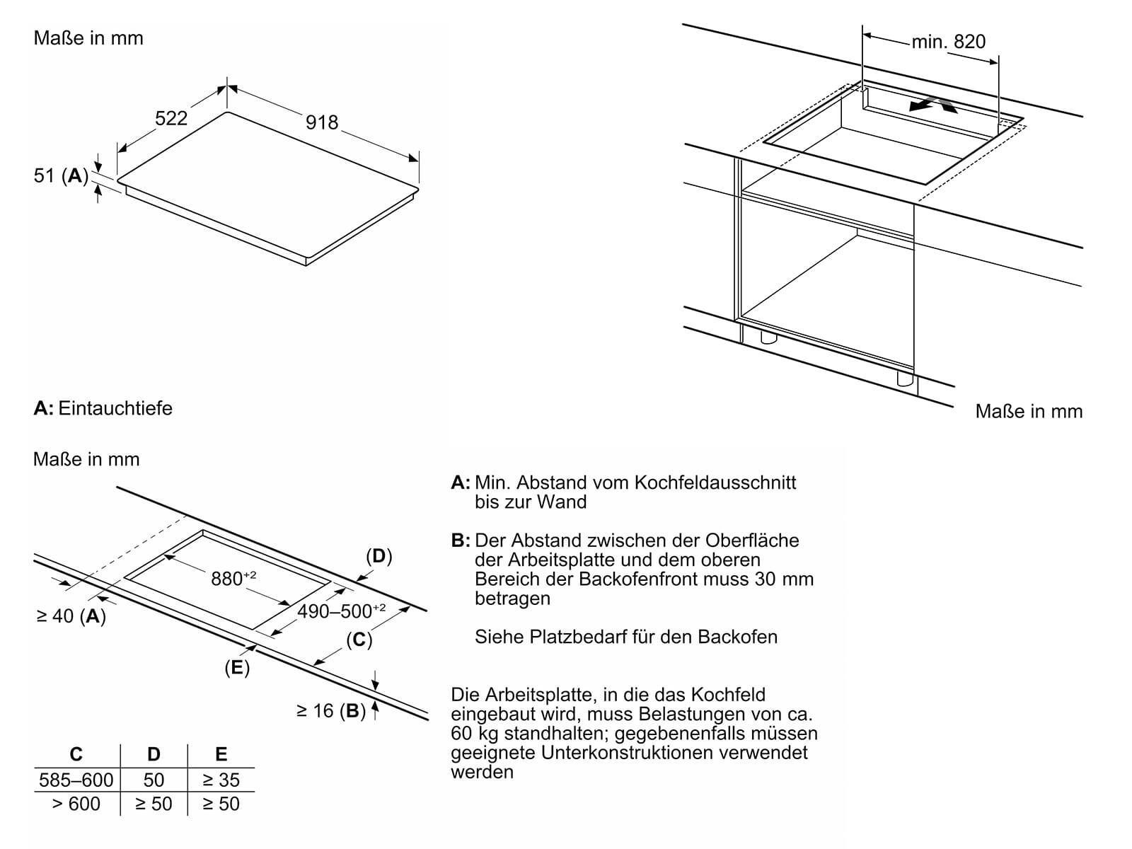 - Erforderliche Nischengröße (HxBxT mm): 51 x 880 x (490 - 500)