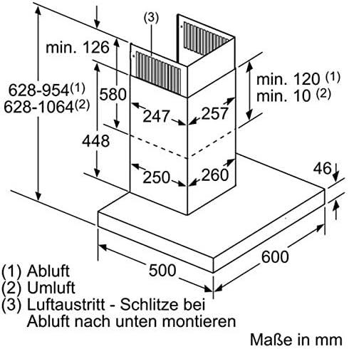 - Gerätemaße Abluft (HxBxT): 628-954 x 598 x 500 mm