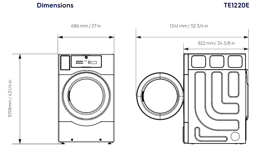 Axiale Luftströmung: Trockenluft strömt in einem direkten linearen Weg durch die Trommel von einer Seite zur anderen und wird sofort nach der Feuchtigkeitsaufnahme abgeführt – minimale Rezirkulation, maximale Trockeneffizienz; ermöglicht einen vollständigen 12-kg-Zyklus in nur 87 Minuten Kommerzielle Bauqualität: Trommel auf fünf Rollenlagern gelagert (statt zwei bei Haushaltsgeräten) – gleichmäßige Lastverteilung, minimaler Verschleiß und bis zu 6× längere Lebensdauer als Haushaltsgeräte; ausgelegt für mehr als 15.000 Zyklen 218-Liter-Trommel: großzügiges Trommelvolumen für überdimensionierte Wäschestücke wie Bettdecken, Frottierwaren und Berufskleidung – höhere Beladungskapazität bedeutet weniger Zyklen und kürzere Gesamtbearbeitungszeit Geringer Wartungsaufwand: Frontöffnung für einfachen Servicezugang, robustes Flusensieb mit ergonomischem Griff zur einfachen Reinigung, Filtersensor verhindert den Start bei nicht korrekt eingesetztem Filter Stapelbar: optionales Stapelkit TE1220E + TE1220E (FP700, separat erhältlich) – Verdoppelung der Kapazität ohne zusätzlichen Stellflächenbedarf; ideal für Betriebe mit begrenztem Platzangebot Flexible Betriebsmodi: OPL-Modus (On-Premise Laundry) als Standard, Münzbetrieb als optionales Zubehör nachrüstbar; Echtzeituhr für Sonderzeiten und Aktionspreise programmierbar Vier Trockenprogramme: Hoch, Mittel, Niedrig und Keine Wärme – angepasst an verschiedene Textilarten und Beladungsmengen; Zeittrocknung für präzise Programmdauer Tür wechselseitig montierbar: Türanschlag links oder rechts montierbar – flexible Aufstellmöglichkeiten bei beengten Raumverhältnissen