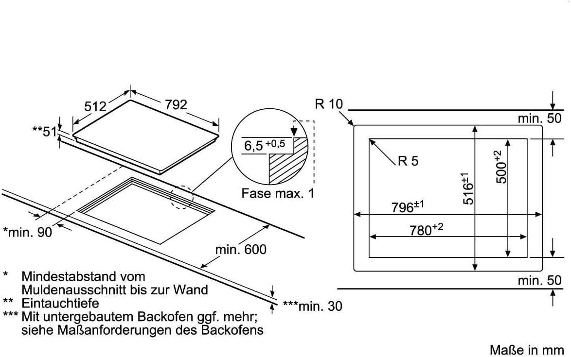 - Nischenmaße für flächenbündige Installation (H x B x T) 51 x 796 x 516 mm